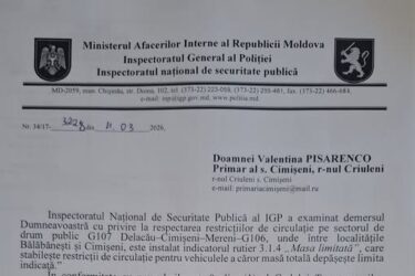 În urma sesizărilor parvenite de la locuitori privind circulația transportului de mare tonaj pe sectorul de drum Delacău – Cimișeni – Mereni, Primăria satului Cimișeni a înaintat un demers către Inspectoratul General al Poliției. Ca urmare, Inspectoratul Național de Securitate Publică al IGP a examinat […]